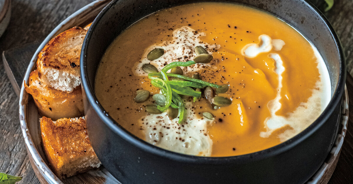 В нем всего три ингредиента и парочка приправ – просто и по-осеннему ярко! При желании можете подать суп-пюре с сыром страчателла или добавить немного жирных сливок (на главном фото статьи — Прим. ред).