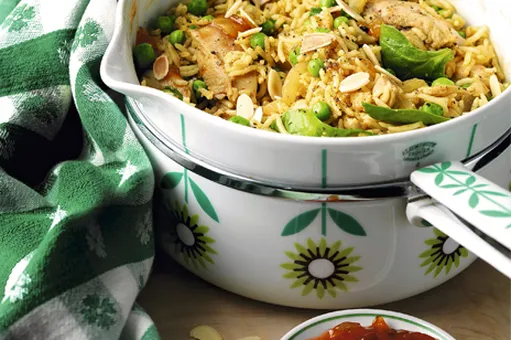 4.В конце добавьте молодой шпинат, приправы для плова, чатни и лепестки миндаля. Подавайте с оставшимся чатни.