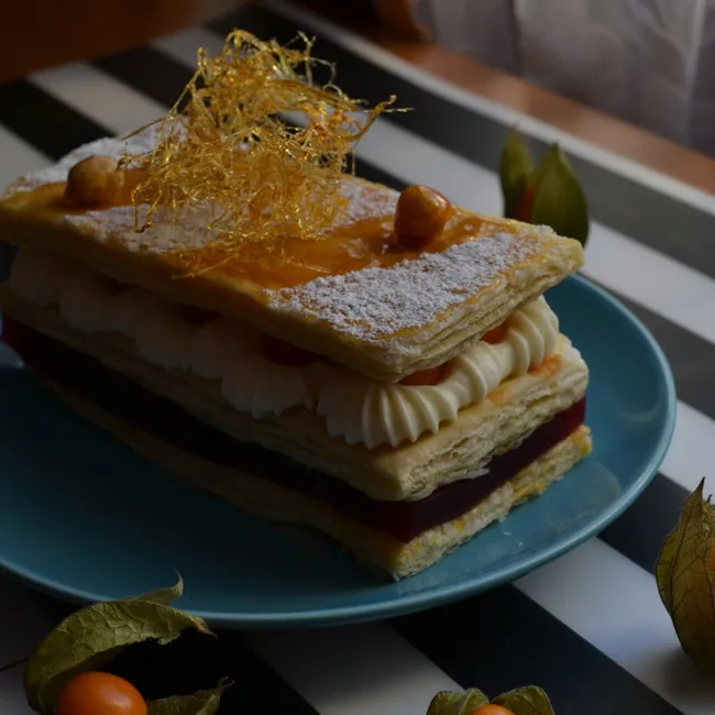 Мильфей с брусничным желе с мёдом, кремом муслин и свежими ягодами