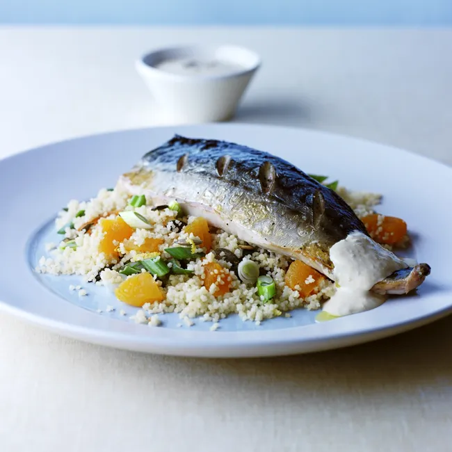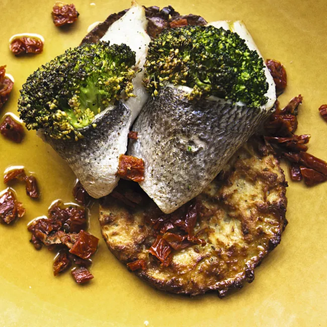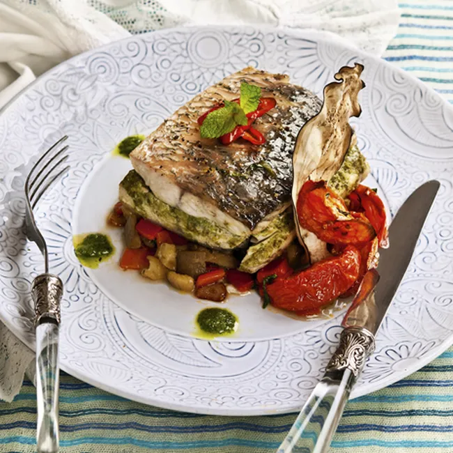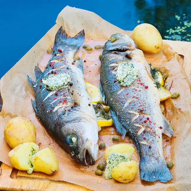 Запеченный сибас с молодым картофелем и «зеленым» маслом