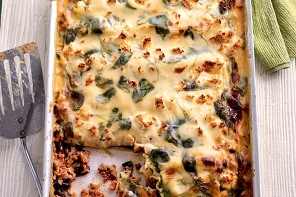 4.Нагрейте духовку до 180 градусов. Сварите каннелони до полуготовности, наполните фаршем, выложите в большую форму. Оставшимся фаршем заполните свободные места. Залейте соусом, посыпьте фетой. Запекайте 30–35 минут.