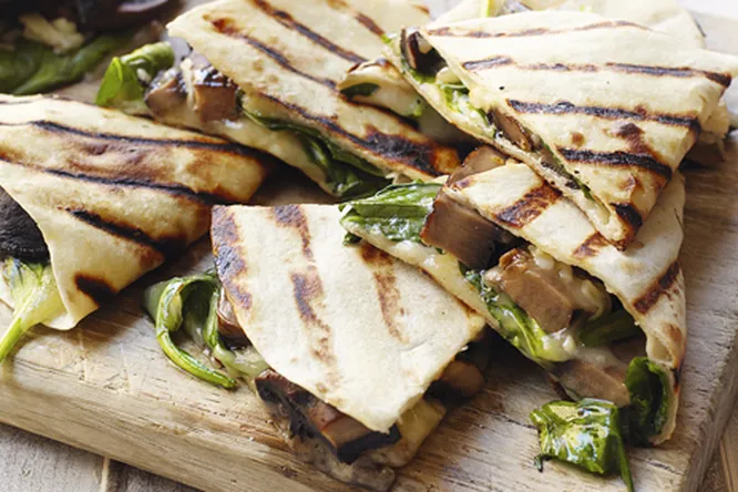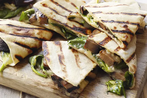 5.Сверните каждую лепешку пополам, накрыв начинку. Обжарьте кесадильи под грилем, по 2 минуты с каждой стороны, или на сковороде-гриль. Нарежьте на порционные куски и подавайте с салатом из помидоров и со сметаной.