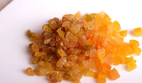 Курагу нарезать мелкими кубиками, изюм промыть и обсушить