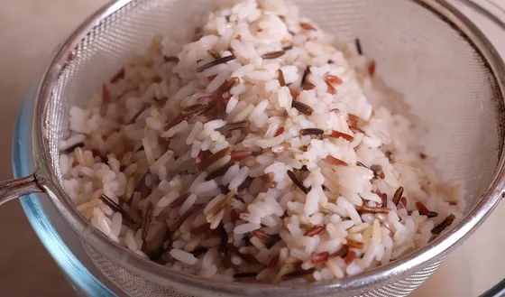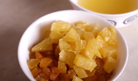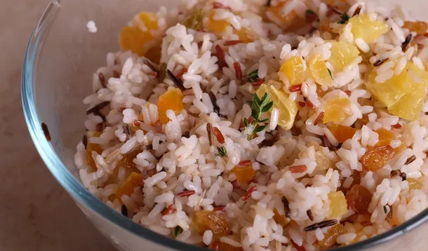 Смешать вместе рис, сухофрукты и апельсин