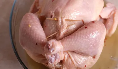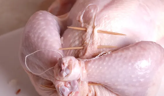 Заколоть брюшко курицы зубочистками или зашить нитью, ножки связать нитью.