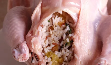 Курицу вымыть и обсушить. Нафаршировать тушку начинкой