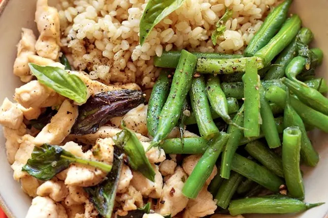 4.Филе нарежьте соломкой. Выложите рис, фасоль и куриное филе с острым соусом на порционные тарелки, посыпьте оставшимся базиликом.