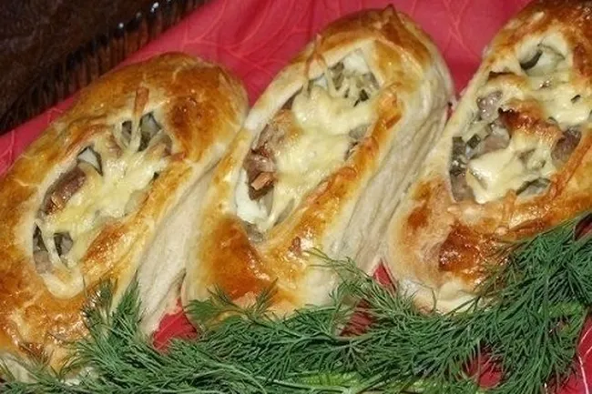 5.В середину нужно выложить 2 с горкой ложки пюре, обжаренный лук с мясом и огурцы. По боковым поверхностям делаем разрезы.