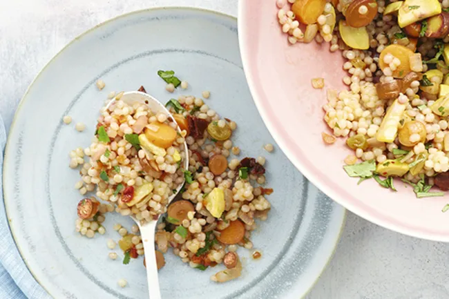 4.Припускайте овощи в масле еще 5 минут, не доводя до размягчения. Осторожно, но тщательно перемешайте их с кускусом, добавив оставшиеся 3 ст. л. масла, уксус, хариссу и соль. Подавайте салат теплым или дайте остыть до комнатной температуры. Перед подачей добавьте нарезанную кинзу и перемешайте.