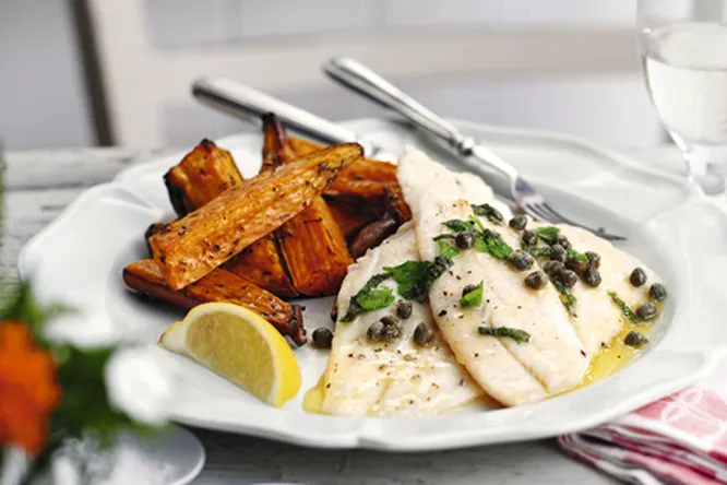 5.Полейте горячим маслом рыбу, выложите на ту же тарелку запеченный картофель, подавайте с зеленым салатом и дольками лимона.