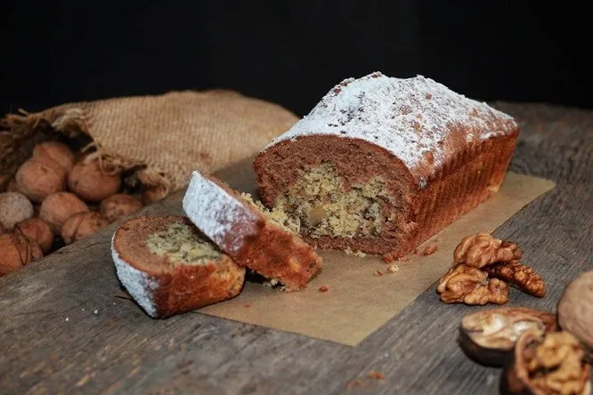 3.В молоке растворите какао. Добавьте в одну часть теста. Во вторую примешайте орехи и лимонную цедру. Форму для кекса смажьте сливочным маслом. Выложите 2 ст. л. шоколадного теста. Затем орехового. Продолжайте выкладывать партиями, пока все тесто не закончится. В конце, при помощи обратной стороны вилки, сделайте мраморные узоры.