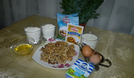 Готовим начинку: орехи пропускаем через мясорубку, смешиваем с сахарной пудрой, добавляем корицу и кардамон. Масло сливочное 200 гр. растапливаем.