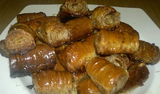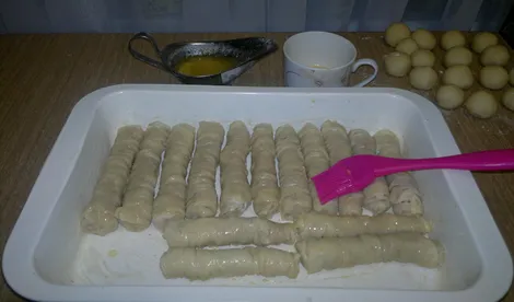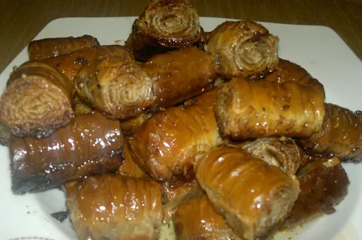 Так готовим все рулеты для домашней пахлавы с грецкими орехами. Выкладываем на противень и смазываем меланжем одного яйца. Помещаем противень в горячую духовку (200 градусов) на 10 минут. Вынимаем противень и обильно смазываем рулеты оставшимся от смазывания сливочным маслом. Теперь отправляем в духовку пахлаву на час , температуру снижаем до 160-170 гр. Рулетики должны загореть.