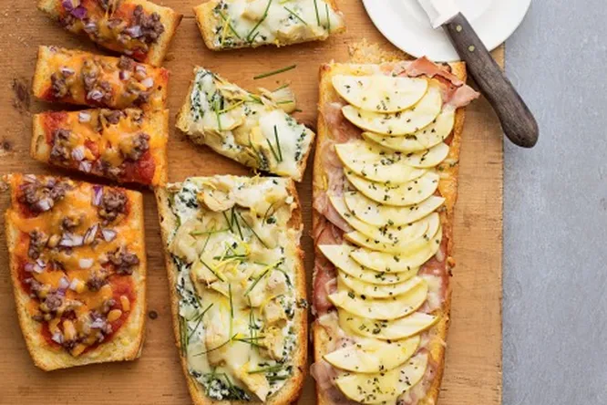 1.Разрежьте багет поперек пополам, затем каждую половинку вдоль на две части, примните руками мякоть. Выложите начинку и запекайте 10–15 минут при 200°С до золотистой корочки.