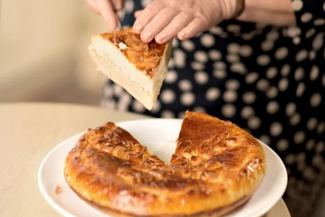 6.Выложите один пласт в круглую форму для пирога, распределите по дну и бортикам, излишки теста срежьте, проведя скалкой по бортикам. На тесте распределите ровным слоем половину