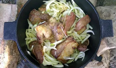 Добавьте куски мяса и жарьте минут 10. Затем добавьте лук.