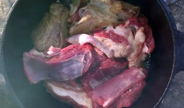 Увеличте огонь до максимума. Если при разделке мяса осталась косточка, обжарить ее до коричневого цвета и отложите. Если вы используете растительное масло, его надо сначала нагреть до появления светлого дымка, а затем, добавив небольшую целую луковицу, прожарить ее до черноты и удалить - это существенно улучшит вкус масла.
