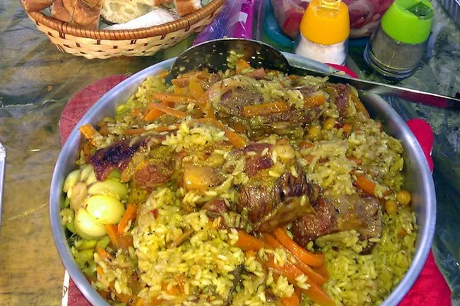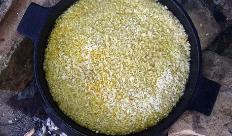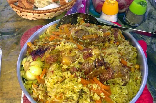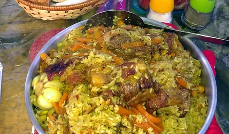 1.Рис промойте до полной прозрачности. Залейте теплой водой, добавьте щепотку соли и оставить на 3-4 ч. Мясо нарежьте большими кусками лук - тонкими полукольцами, курдючное сало - кубиками 1 см, морковь - длинными брусками толщиной около 1 см. Чеснок очистите от шелухи и корешков, но не разделяйте на зубчики.