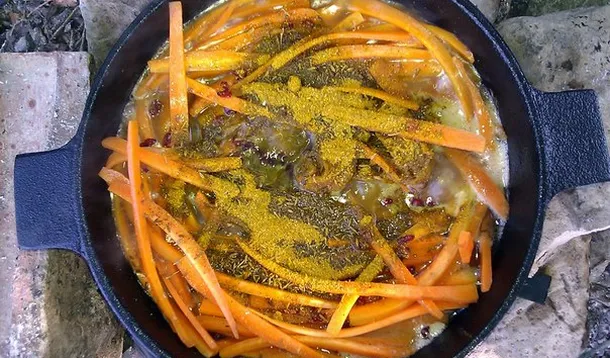 Добавьте в казан морковь, жарьте 10 минут, помешивая.Разомните в руке зиру и кориандр, всыпьте в казан. Убавьте огонь до среднего и жарьте до мягкости моркови, 5-10 мин.