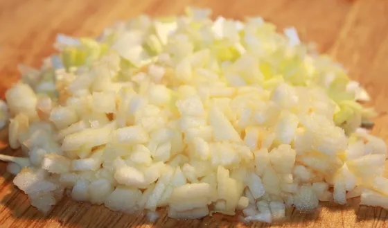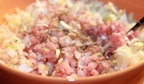 Нежирную свинину нарезать кусочками и пропустить через мясорубку. Добавить к мясному фаршу лук, яблоки, семена горчицы, тимьян, соль по вкусу и хорошо перемешать.