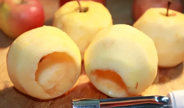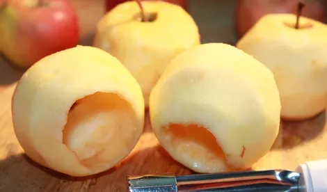 Яблоки (желательно одинакового размера) хорошо промыть, удалить семечки и очень аккуратно вынуть мякоть (ее не выбрасывать, она еще пригодится), оставив хвостики. Очистить от кожицы.