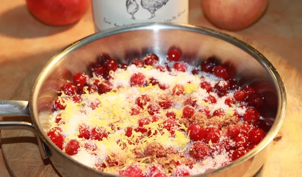 Приготовить соус. В емкость, в которой будут готовиться яблоки, выложить клюкву, сахар, цедру лимона, корицу и влить вино. Поставить на огонь и, помешивая, довести до кипения.