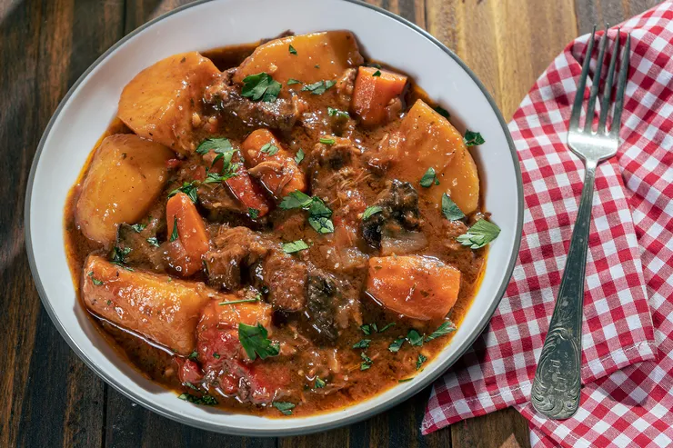 Нашли для вас рецепт одного из простейших видов тушёного мяса. Это говядина, которая готовится сразу с гарниром. В качестве гарнира в этом случае берём картофель. Давайте же приступим к приготовлению тушёной говядины с картошкой.