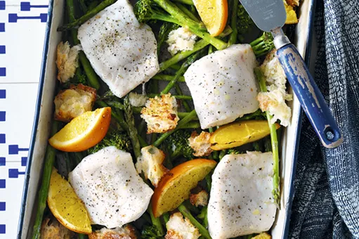 3.Вокруг рыбы поместите дольки апельсина и кусочки хлеба. Сбрызните рыбу маслом, посолите и поперчите.
