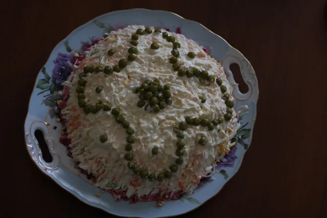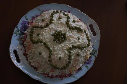 4. Украшаем зеленым горошком. Отправляем в холодильник пропитаться.
