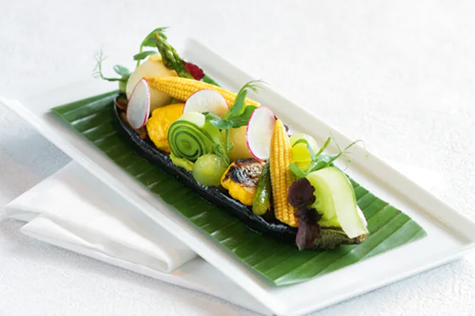 4.Для подачи выложите на тарелку ломтик баклажана, сверху уложите овощи, украсьте зеленью, кружочками редиса и тонкими ломтиками огурца в виде спирали.