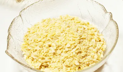Почистите яйца, отделите белки от желтков. Натрите на крупной терке все белки и один желток. Оставшиеся желтки натрите в отдельную тарелку.
