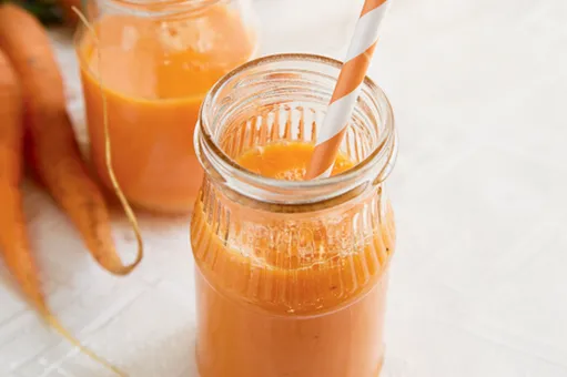1. Манго очистите, срежьте мякоть с косточки. Яблоки очистите, удалите сердцевину. Выложите манго и яблоки в чашу блендера, влейте морковный сок, приправьте мускатным орехом.