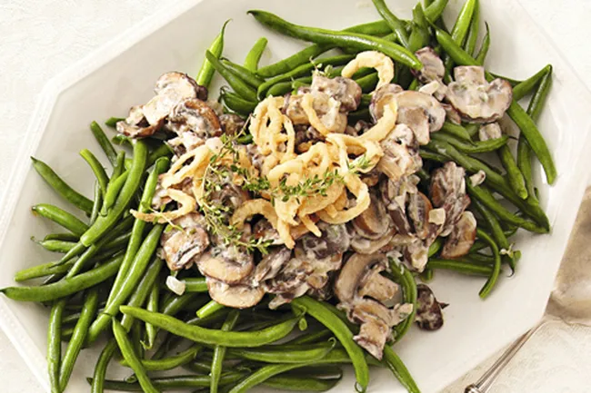 На 12 порций. Пункт 1: возьмите 1,35 кг фасоли. Пункт 2: по 2 ст.л. оливкового масла и маргарина, половину крупной луковицы (280-340 г), 1/4 ч.л. соли, 1/8 ч.л. перца. Пункт 3: 900 г шампиньонов, 0,5 ч.л. соли, тушите 14 минут. Пункт 4: 1/4 ст. муки, 2 ст. молока, 2 ч.л. тимьяна, 1/8 ч.л. кайенского перца, 1/8 ч.л. соли, 0,5 ст. жареного лука.