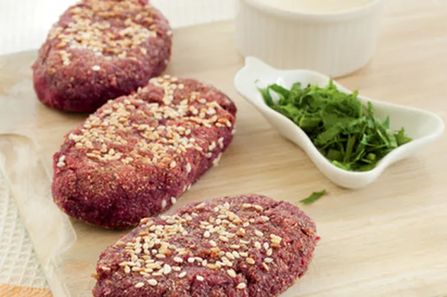 3.В чаше смешайте свеклу, лук, яйца, муку, изюм, соль. Массу разделите на 8 шариков. Сформируйте котлеты, запанируйте в сухарях, обжарьте с двух сторон на подсолнечном масле с двух сторон до румяной корочки (или приготовьте в пароварке). Посыпьте кунжутом, подавайте со сметаной.