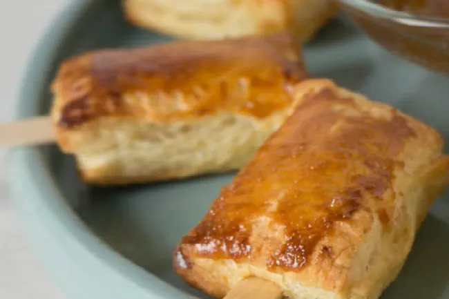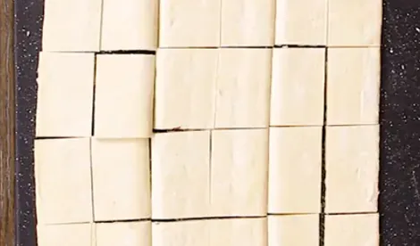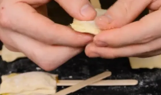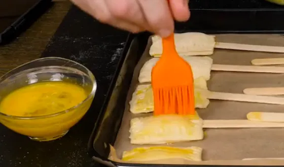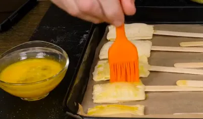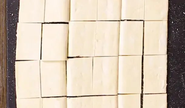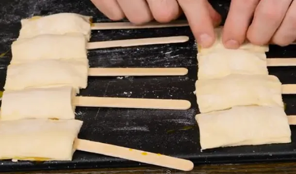 Размороженное слоеное тесто нарезать на четное число прямоугольников.