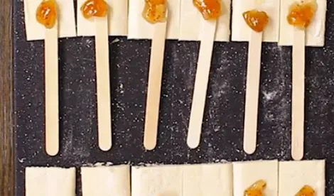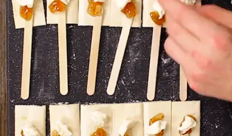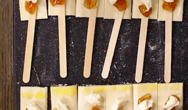 На половину прямоугольников положить деревянные палочки и по чайной ложке джема.