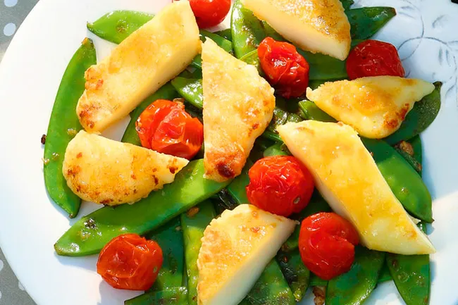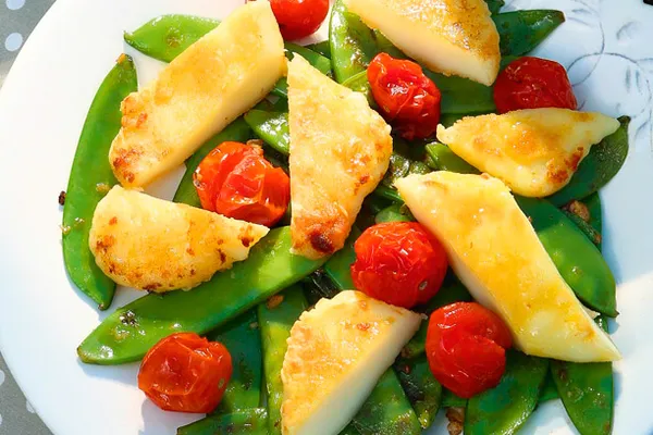 2.Разогрейте 2 ст. л. масла в широкой сковороде и быстро обжарьте стручки гороха и помидорки-черри, переложите в салатник.