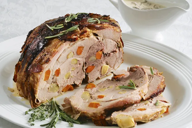 2.В мясе длинным тонким ножом сделайте глубокие надрезы, начините морковью, сельдереем и чесноком. Натрите мясо щедро солью и смесью перцев, оберните ломтиками бекона, выложите сверху веточки тимьяна ирозмарина (2 оставьте). Плотно заверните окорок в несколько слоев фольги и поместите в разогретую до 190 градусов духовку. Запекайте 2 часа (из расчета 1 час на 1 кг мяса).