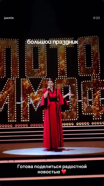 В четверг Жасмин выступила на юбилейном концерте Национальной музыкальной премии «Золотой граммофон». Исполнив песню «Головоломка», артистка объявила: «Друзья, у меня есть потрясающая новость... Сегодня в моей семье большой праздник. Мой старший сын подарил мне первого внука. Представьте себе! В 4 утра 34 минуты... Для меня сегодня это большое событие, большая красивая новость... Это большой подарок сегодня, получить такой сюрприз. Спасибо огромное!»
