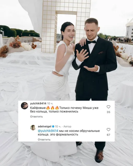 Блогер Адель Вейгель прокомментировала, почему она и Миша Литвин не носят обручальные кольца, хотя недавно сыграли роскошную свадьбу. Подписчики обратили внимание, что Миша уже появляется без кольца, и спросили: «Только поженились — почему он его не носит?» Адель ответила лаконично: «Мы не носим обручальные кольца, это формальность».