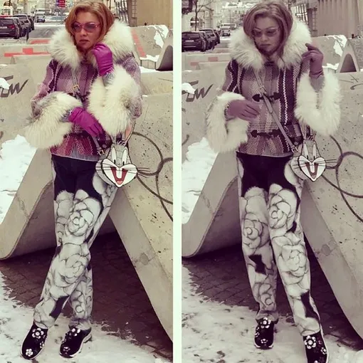 Тогда многие почитатели таланта оперной дивы встали на ее защиту. Но наряд артистки на последней фотографии, которую она разместила на своей странице, смутил не только экспертов моды, но и ее преданных поклонников. На снимке Анна одета в бледно-фиолетовую куртку с меховой опушкой и черные брюки с крупным цветочным принтом, а дополнила свой образ звезда малиновыми перчатками, сумкой в виде кролика Багза Банни и очками в розовой оправе.