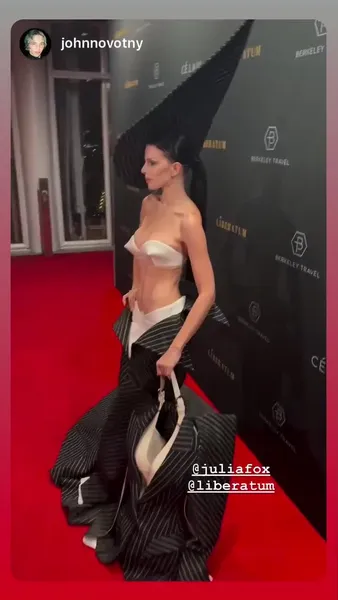 Джулия Фокс известна эксцентричным стилем. Актриса и модель никогда не боялась рисковать. Джулия регулярно попадает в заголовки газет благодаря экспериментальным нарядам, поэтому её новый образ не стал сюрпризом. В среду вечером Фокс появилась на благотворительном гала-вечере Liberatum Cultural Honor Gala в Лондоне и привлекла всеобщее внимание атласным конусообразным бюстгальтером цвета шампанского и костюмом в тонкую полоску — ансамблем от Robert Wun из коллекции осень-зима 2025.