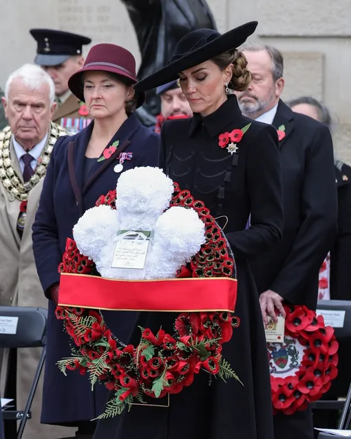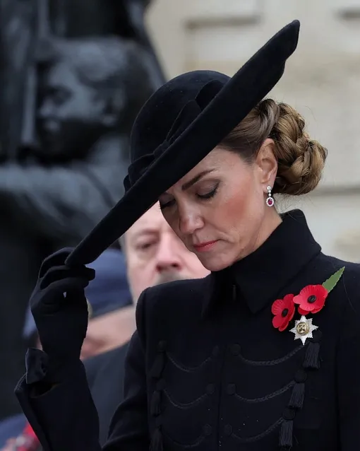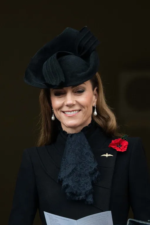 Кейт Миддлтон посетила службу в честь Дня перемирия в Лондоне. Для выхода в свет она выбрала чёрное пальто от дизайнера Кэтерин Уокер и по традиции прикрепила к лацкану брошь. Однако если в предыдущие годы она надевала украшение в виде трёх маков, чтобы отдать дань памяти солдатам, погибшим в Первой мировой войне, то в этот раз вместо букета принцесса Уэльская отдала предпочтение всего одному цветку, нарушив заведённое Елизаветой II правило.