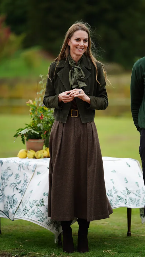 Классический наряд в стиле кантри с накладными карманами, воротником-стойкой и утягивающей талией Кейт дополнила тёмно-коричневыми замшевами сапогами до колена на блочном каблуке, созданными Gianvito Rossi. Многослойный образ завершила чёрная водолазка и фактурная юбка-мили от Ralph Lauren, которую она надевала 18 сентября, когда проводила для Мелании Трамп экскурсию по саду во Фрогморе.