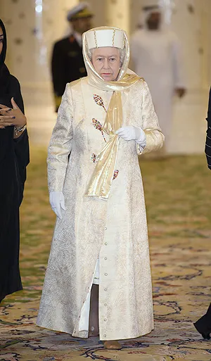 Елизавета II последовала мусульманским традициям: она вошла в мечеть, как и положено женщинам, босой, с платком на голове.