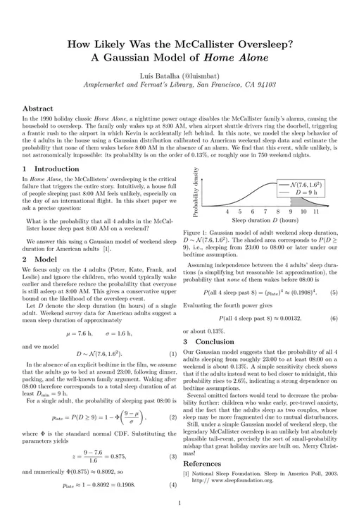 Итак, согласно упрощённой модели, вероятность того, что вся семья Маккалистер благополучно проспала рейс на автобус и самолёт, равна примерно одному случаю на каждую тысячу выходных ночей. Поэтому закрадывается смутное сомнение, что Кевина могли забыть одного дома отнюдь не случайно, а... специально.