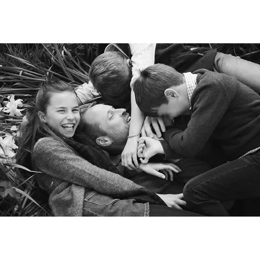 У себя в соцсети Шиннер поделился своей самой любимой фотографией, где запечатлён один из самых трогательных моментов общения будущего короля с детьми. На снимке, выполненном в чёрно-белой эстетике, сфотографирована «куча-мала» — на лужайке с нарциссами лежит смеющийся принц Уильям, его обнимают и хохочут навалившиеся на него Джордж, Шарлотта и Луи.