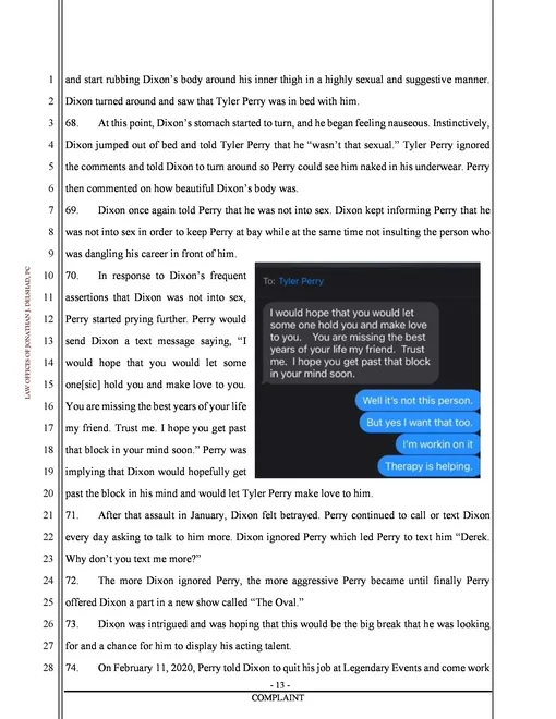В иске магната сравнивают с Харви Вайнштейном, Биллом Косби, Р. Келли и Шоном «Пи-Дидди» Комбсом, решившим, что деньги и влияние дают им право требовать всё, что они захотят. По словам Диксона, он даже отказался от 400 000 долларов за съёмки в «Овальном кабинете», чтобы больше не иметь дела с Перри.