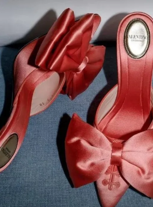 На Памеле надет шёлковый чёрный халат с принтом из жёлтых роз, ажурные белые колготки и насыщенного кораллового цвета туфли на шпильке, украшенные с бантом, от Valentino — ещё одна дань тренду 80-х, начавшему набирать обороты минувшей весной.