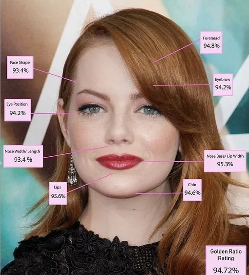 Доктор Джулиан Де Сильва, известный специалист по лицевой эстетике, решил выяснить, какая знаменитость обладает лицом, идеально вписывающимся в этот волшебный коэффициент. После тщательного изучения и расчётов выяснилось, что пальму первенства завоевала Эмма Стоун.